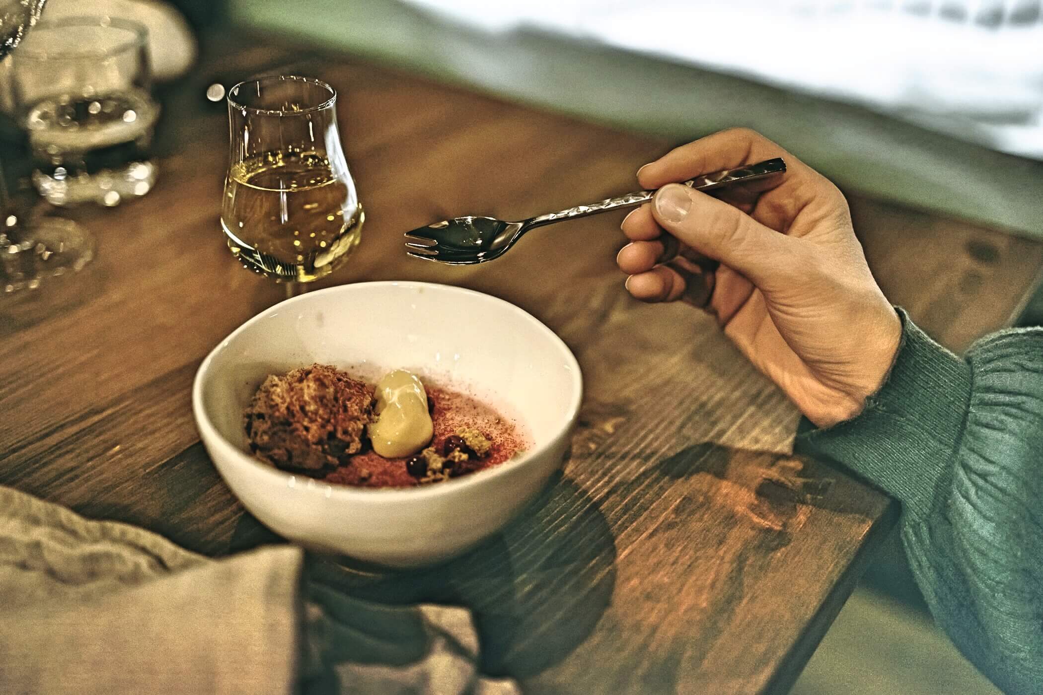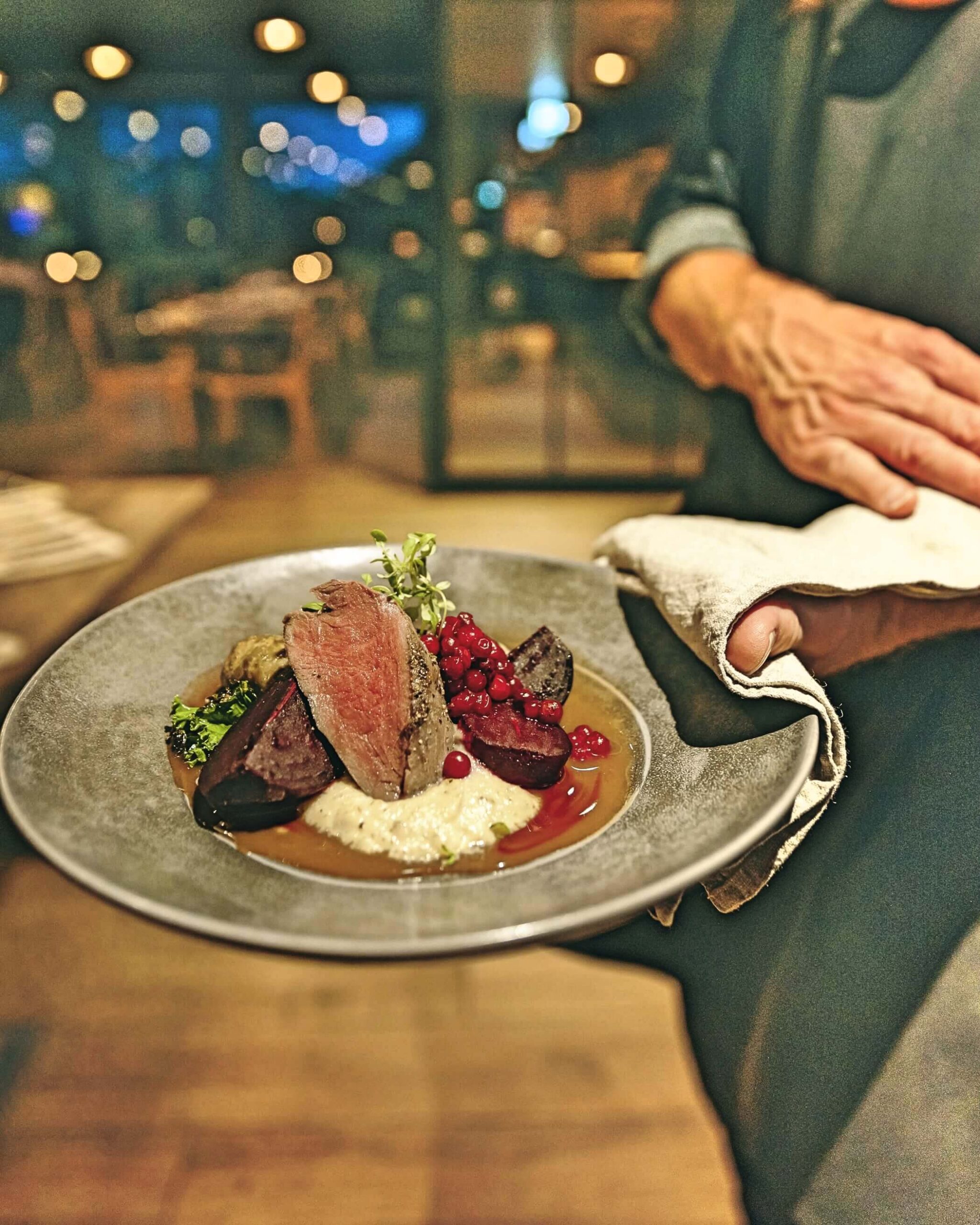 Dishes are crafted using wild herbs, game, Arctic berries, freshwater fish, and locally raised meats. Many products come from Sámi partners and nearby farms. Fresh herbs are cultivated in the hotel’s own greenhouse during summer and preserved for winter use.