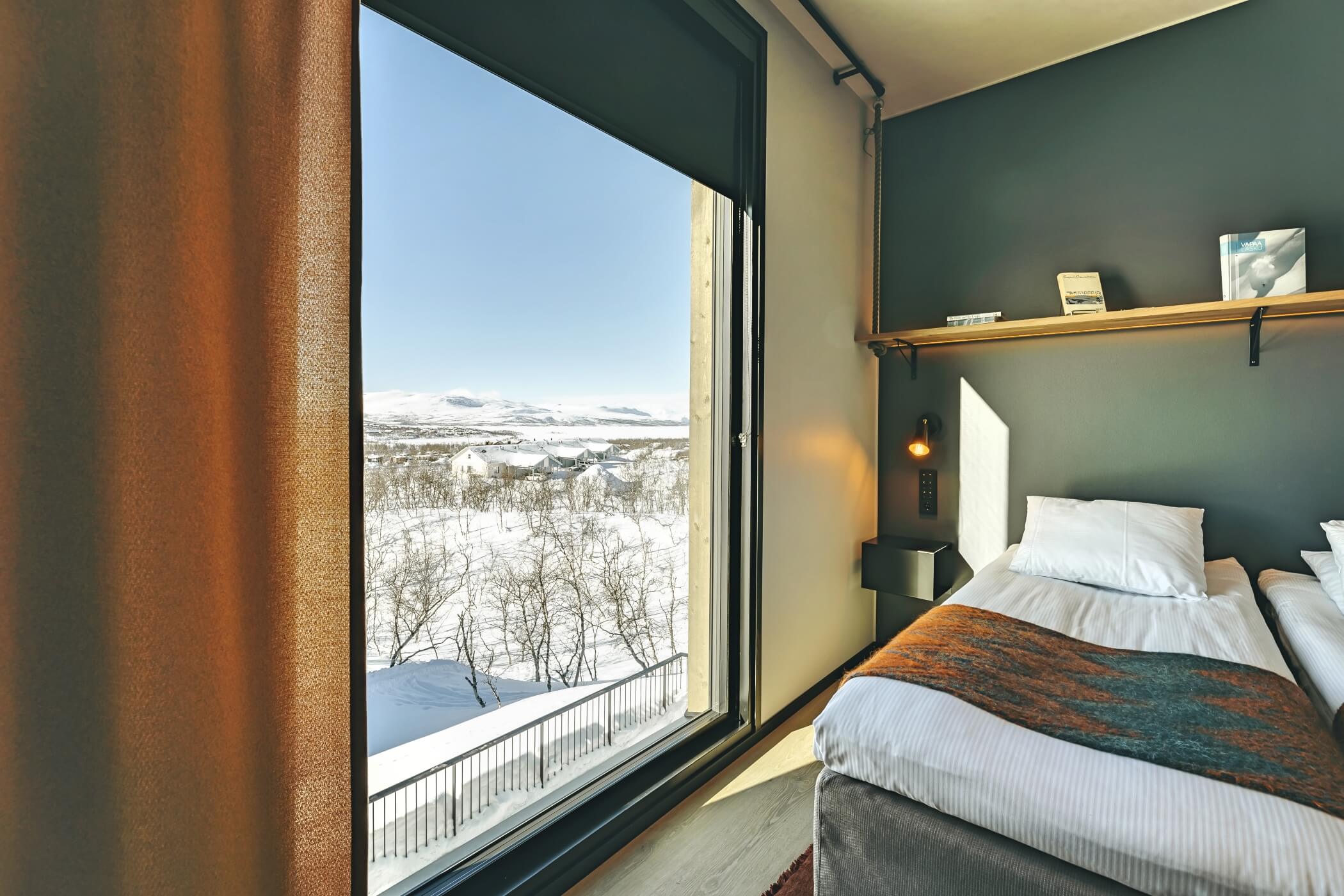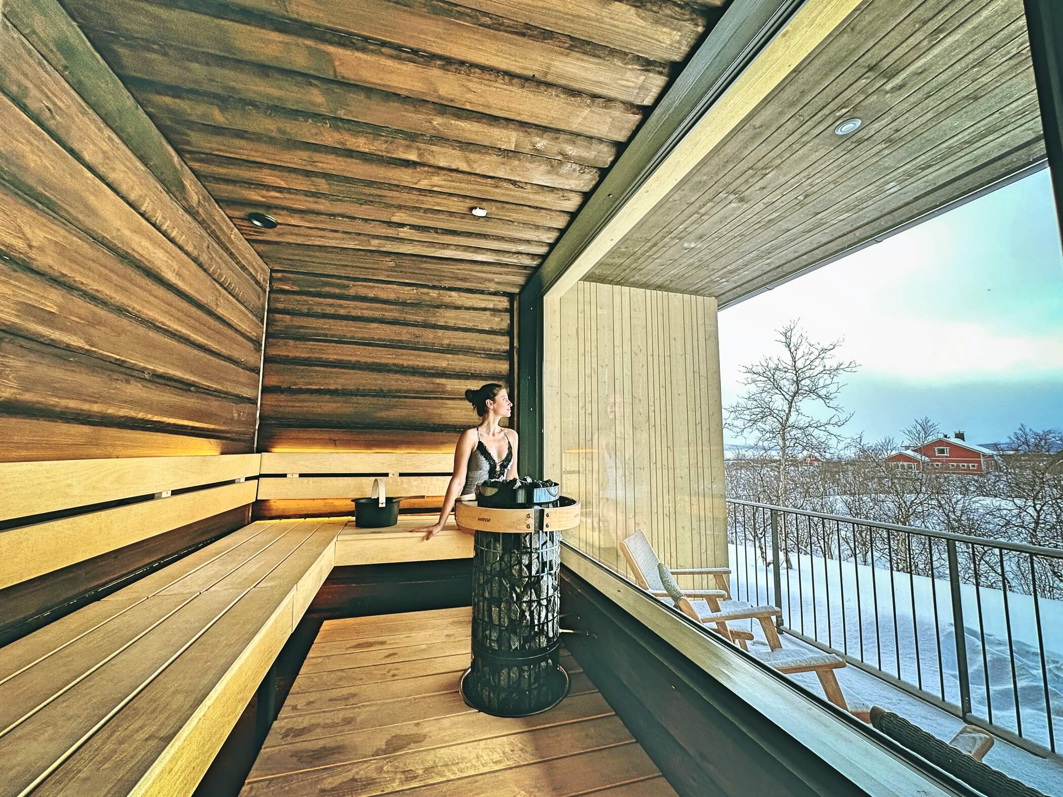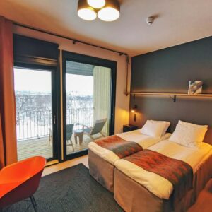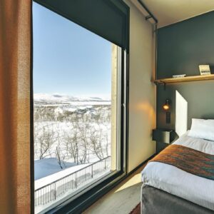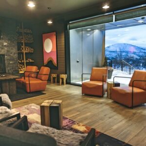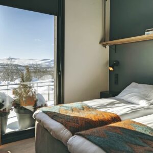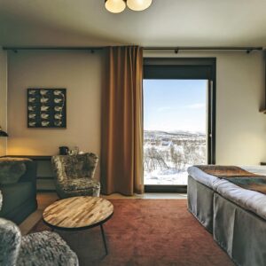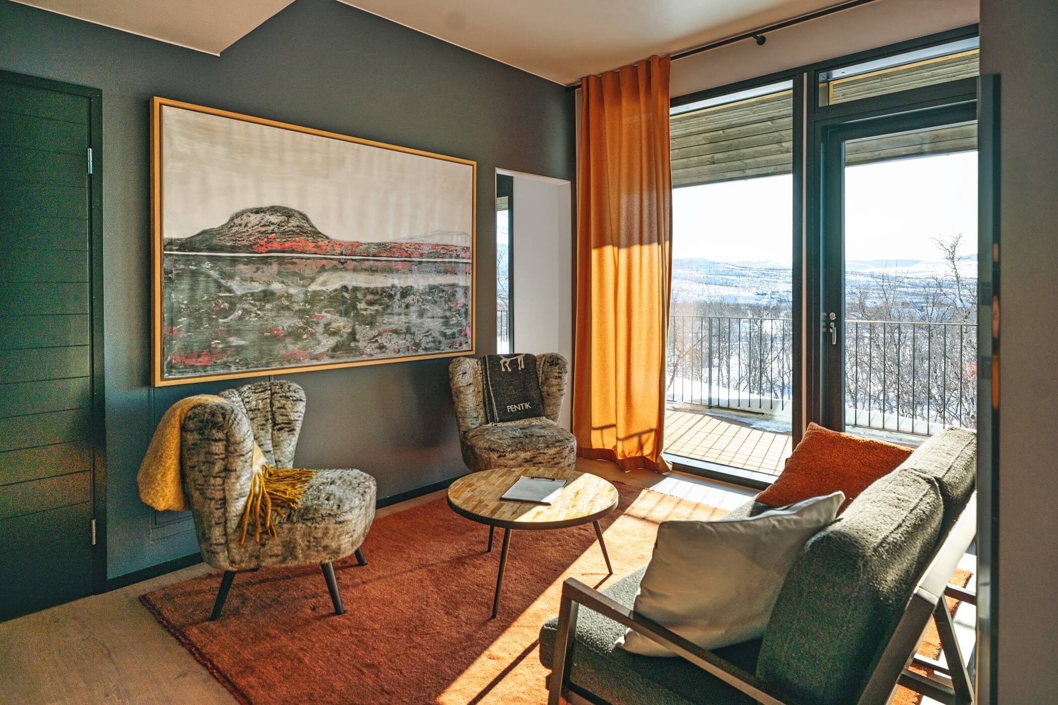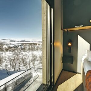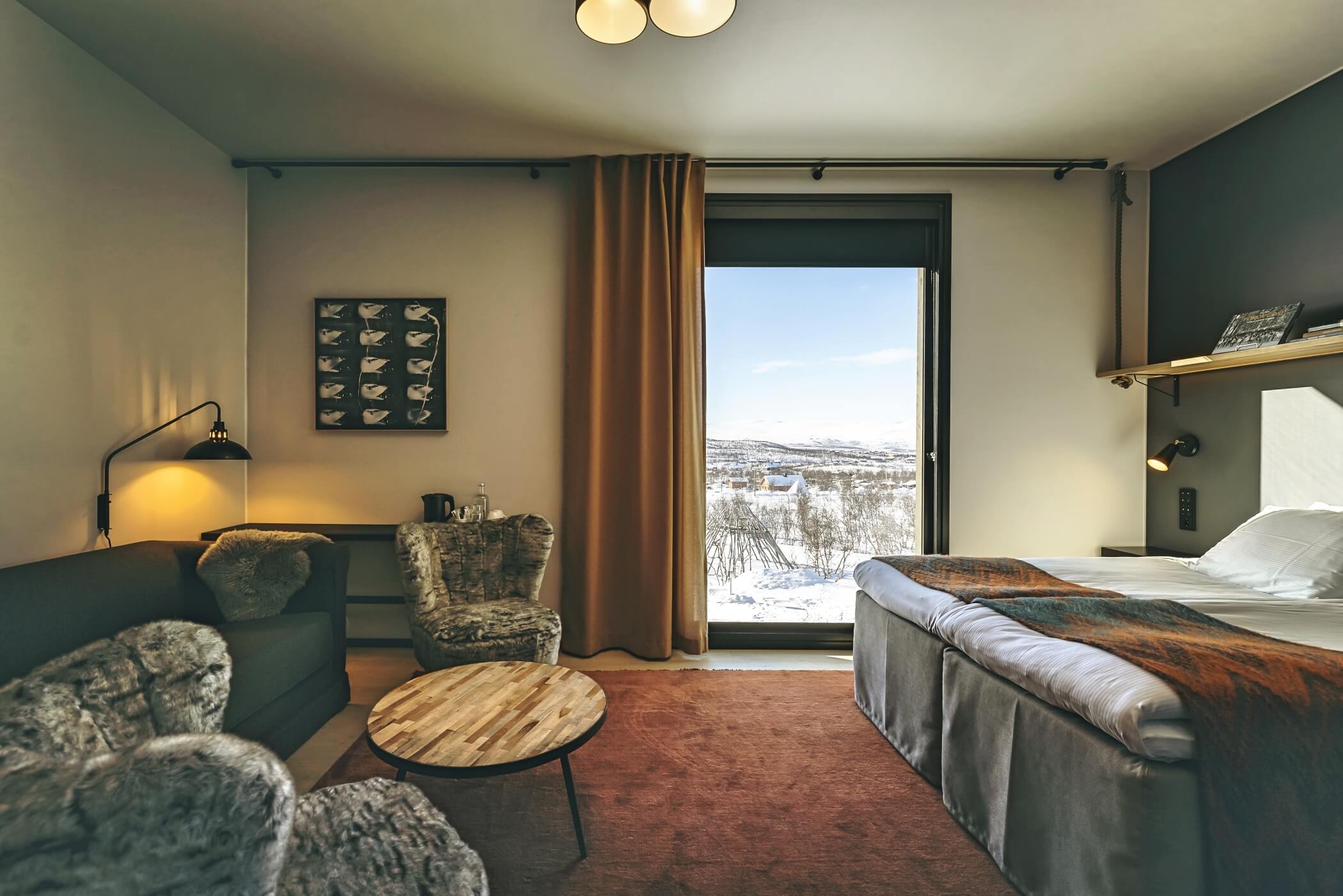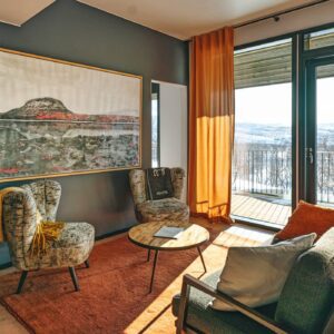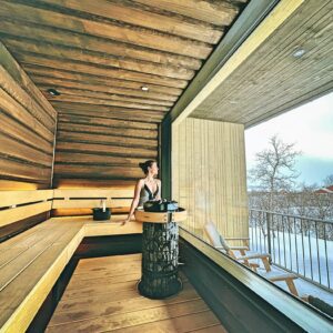 Guests enjoy access to calming common areas including a lounge with fireplace, a terrace with mountain views, and a sauna area designed to face the legendary Saana Fell.