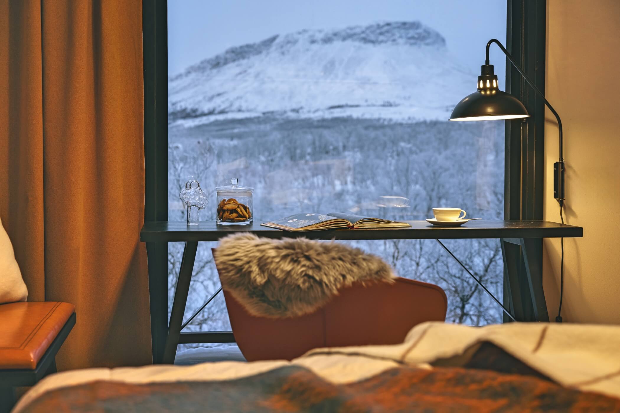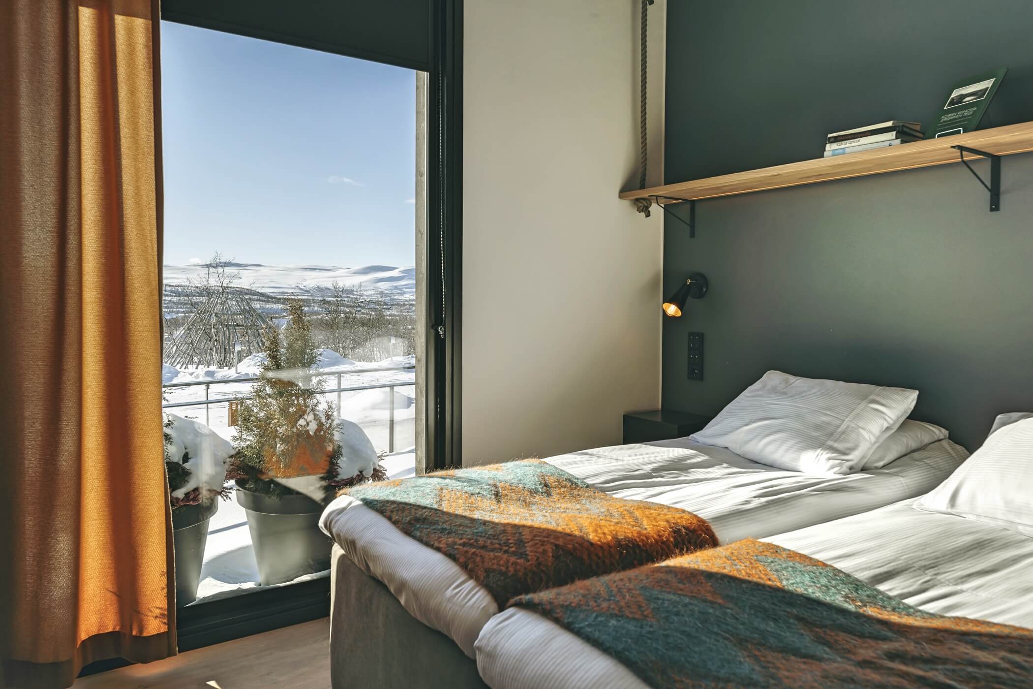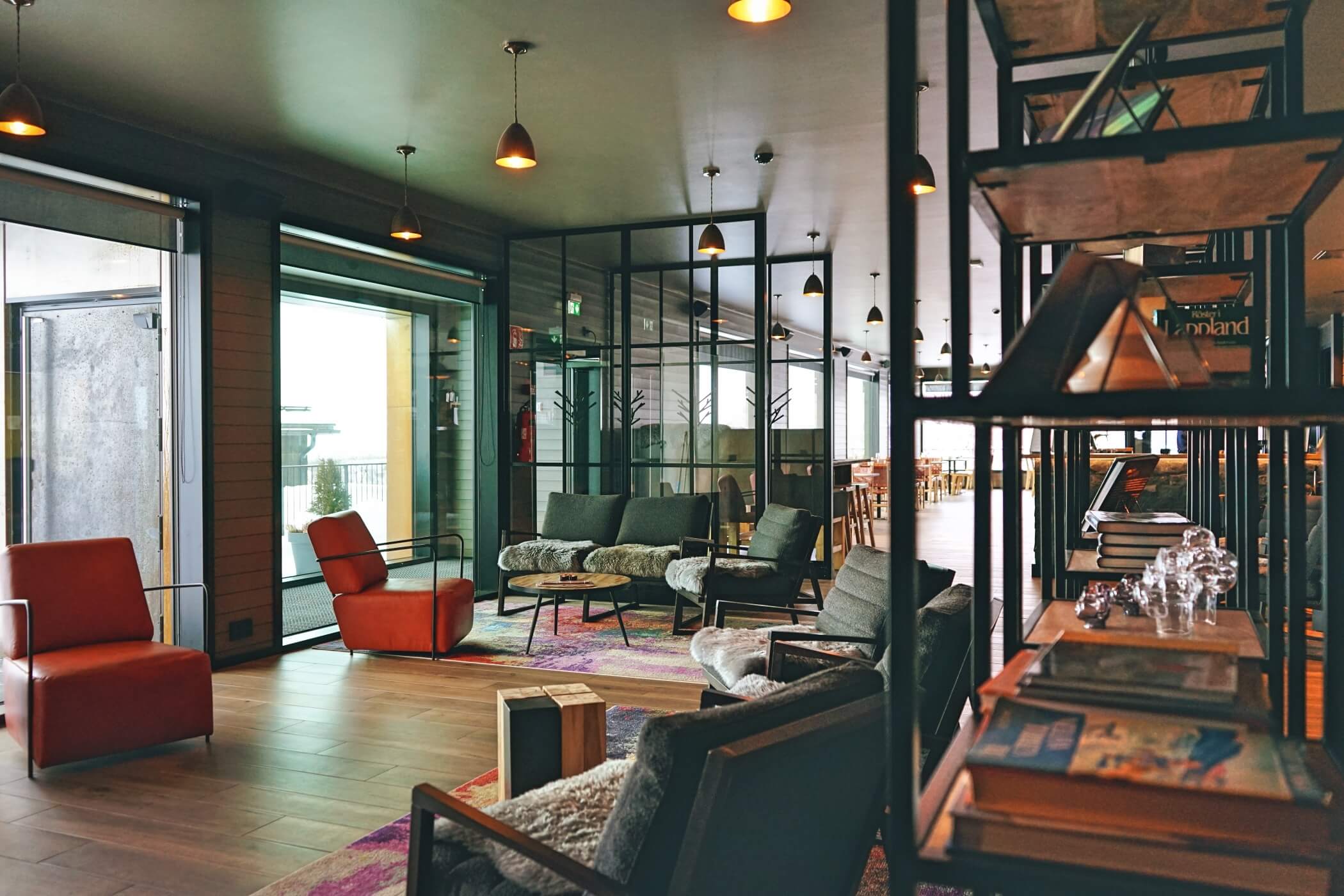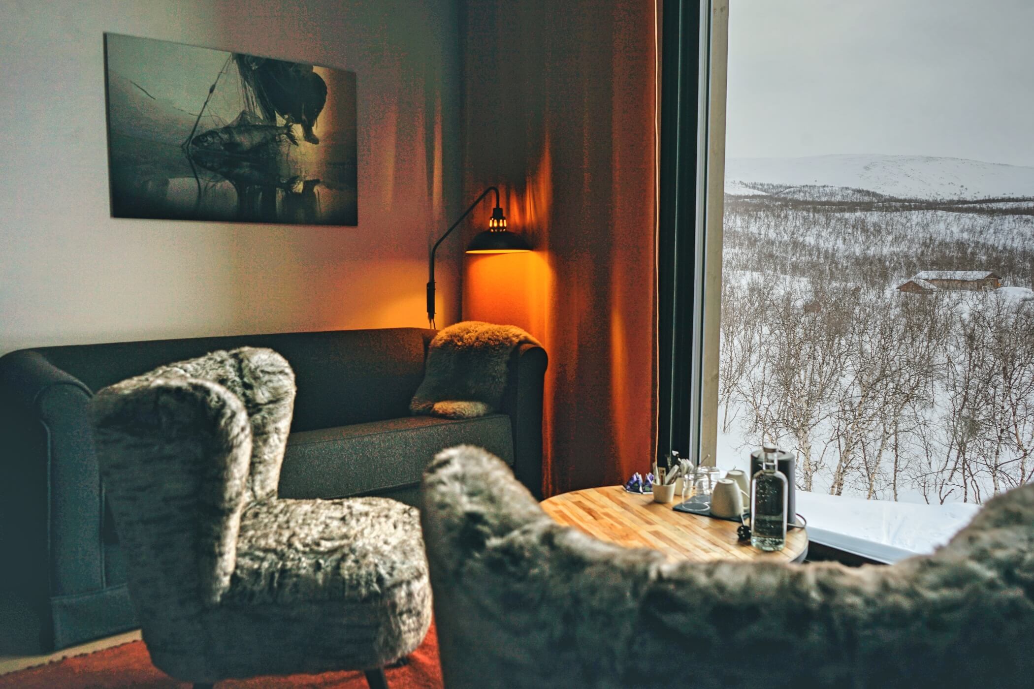 Guests enjoy access to calming common areas including a lounge with fireplace, a terrace with mountain views, and a sauna area designed to face the legendary Saana Fell.