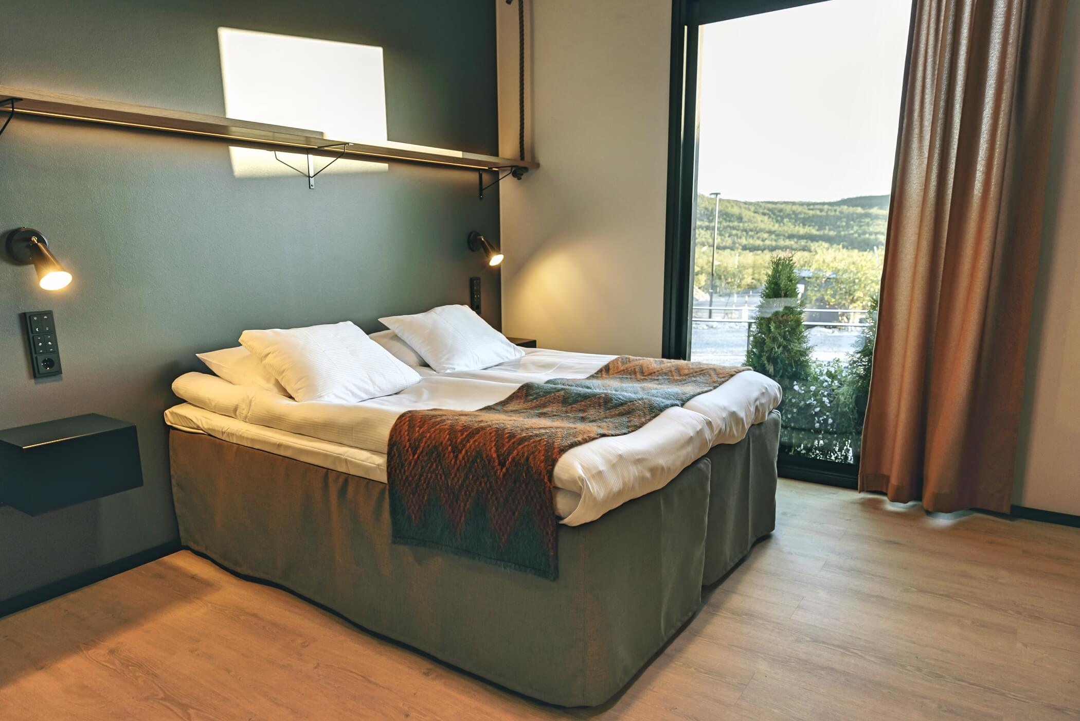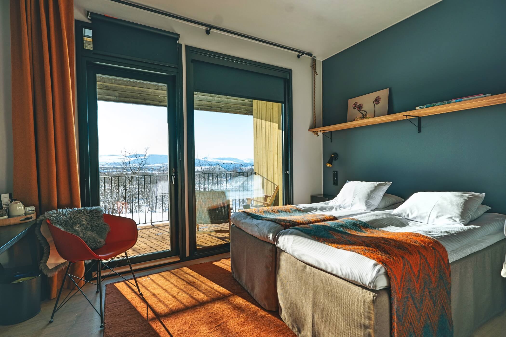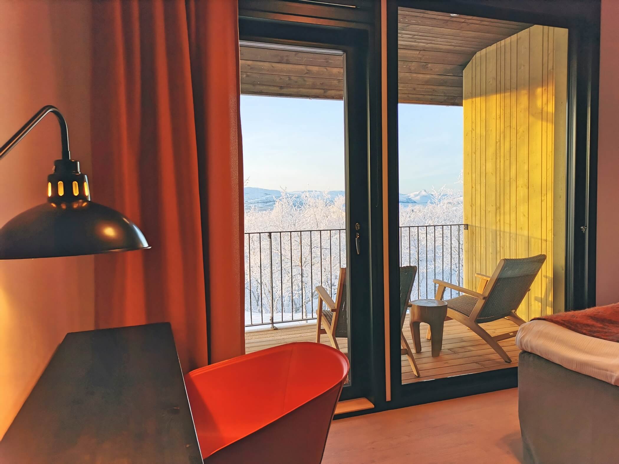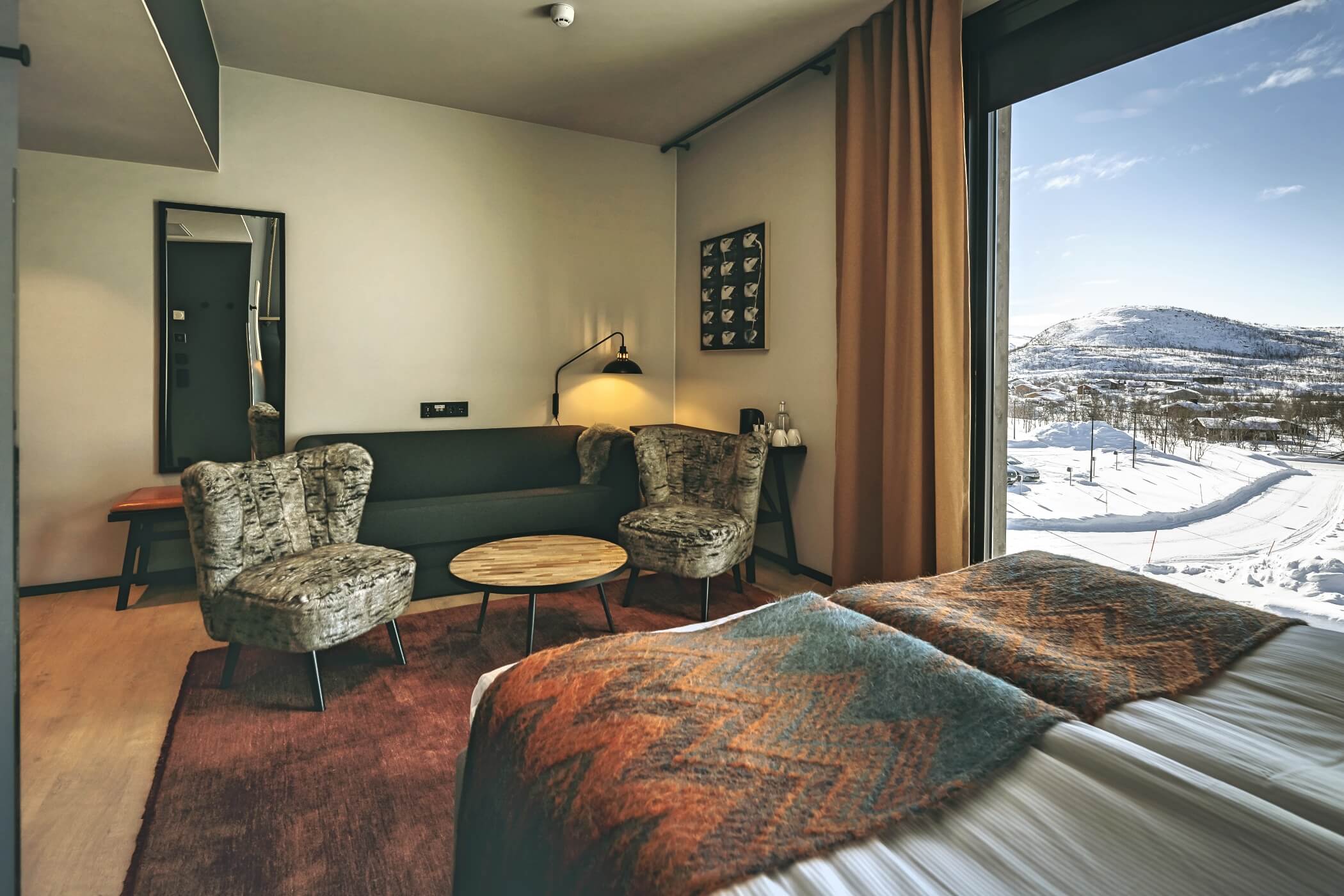 Guests enjoy access to calming common areas including a lounge with fireplace, a terrace with mountain views, and a sauna area designed to face the legendary Saana Fell.