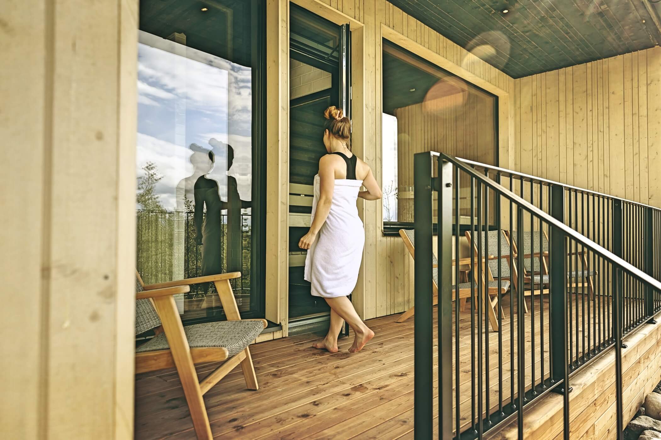 It features two double bedrooms, a living room with desk, a private sauna, and its own terrace. With views over the lake and direct access to nature, it offers the highest level of space and comfort.