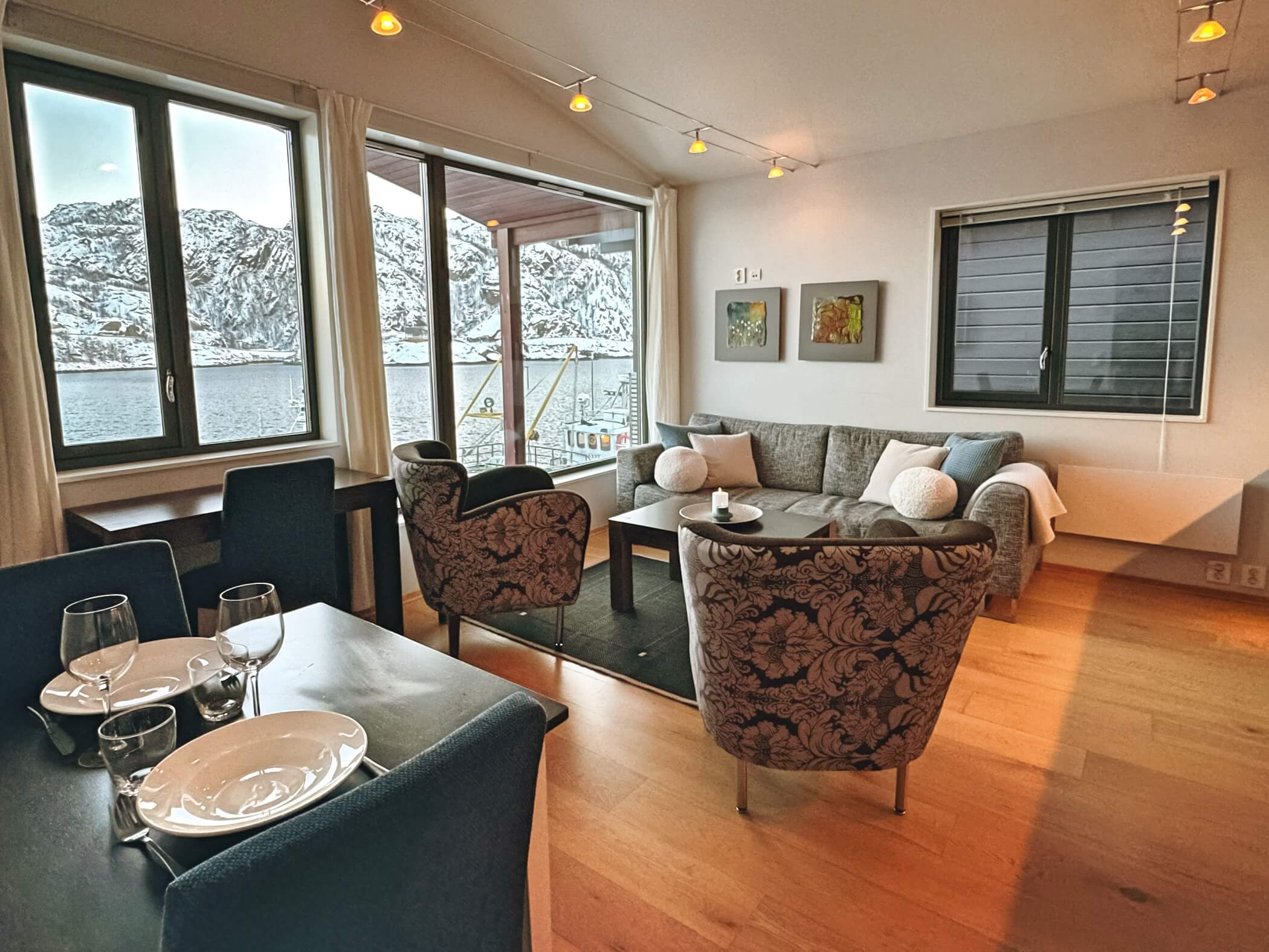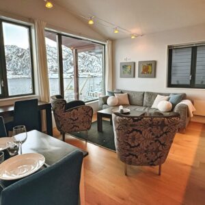 The living rooms open to striking harbour or fjord views and are furnished with soft seating and a dining area for six.