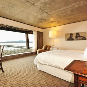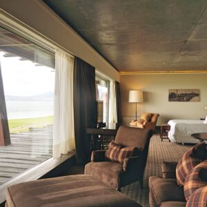A spacious corner suite with sweeping fjord views, a living area for reading or unwinding, and a curated minibar that includes both soft drinks and Chilean spirits.