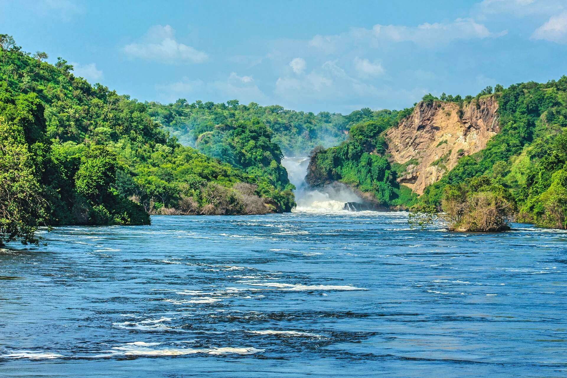 Murchison Falls National Park, home to the powerful waterfall, hosts a mesmerizing diversity of fauna, from elephants to hippos. Witness the powerful convergence of the Nile River, a spectacle that epitomizes the raw beauty of nature.